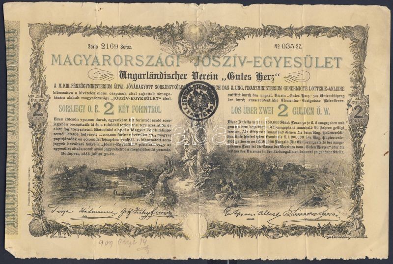 1888. "Magyarországi Jószív Egyesület" sorsjegye 2Ft-ról két klf színben, az egyik bélyegzővel
