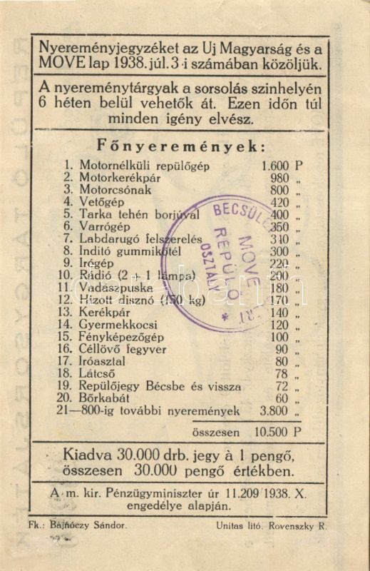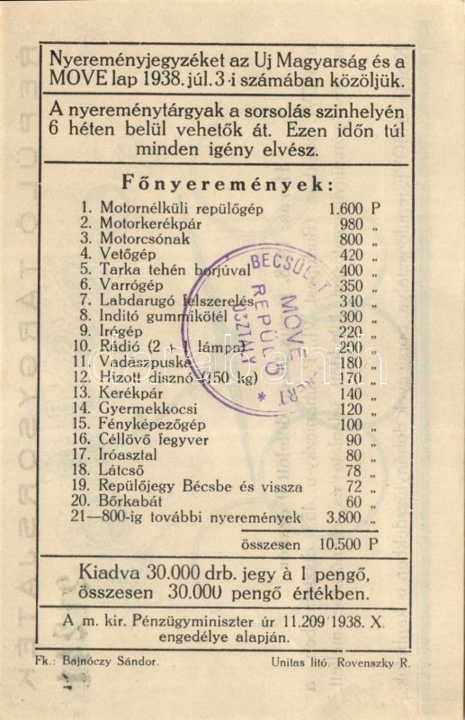 1938. "MOVE" repülő tárgysorsjáték (2x) egymásutáni sorszámmal!