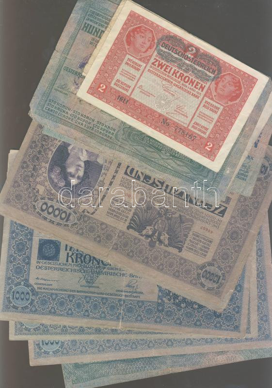 1902-1918. Érdekes korona tétel: fekete vagy piros "Deutschösterreich" fny-sal 1K(2x), 2K(1x), 100K(2x), 2klf tipusú 1000K (4x) + piros "Magyarország" körbélyegzővel 10K(1x), 20K(3x), 1000K (3x), 10000K(1x) + piros magyar+fekete román bélyegzővel 20K(1x) + román ill. szerb ellenbélyegzőkkel 2K(2x), 10K(1x), 20K(2x), 50K(1x), 100K(1x) összesen 25db T:II,III,IV