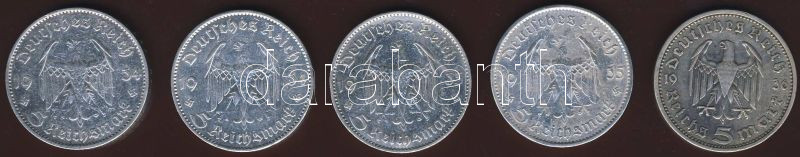 Német 3.Birodalom 1934-35. 5M Ag Garnisonskirche" (4x) + 1936. 5M Ag "Hindenburg" T:2/3