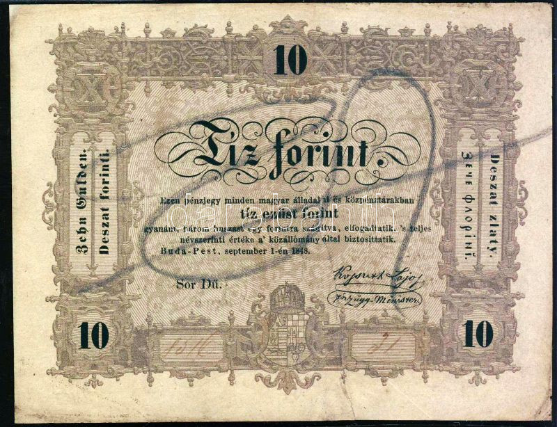 1848. 10Ft "Kossuth bankó". 10Ft előlapon kézzel érvénytelenítve, hátl... https://www.darabanth.com/en/83-Online-auction/83.0/Numismatics/~5080/1848-10Ft-Kossuth-banko-10Ft-elolapon-kezzel-ervenytelenitve-hatlapi-roman-nyelvu-szo~II173272