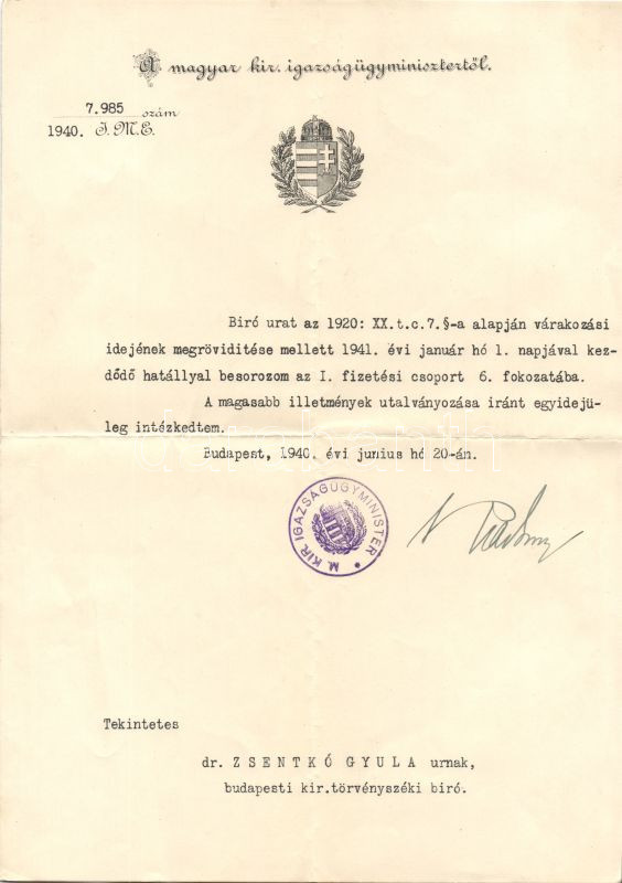 1935 Radocsay László ighazságügyminiszter aláírása