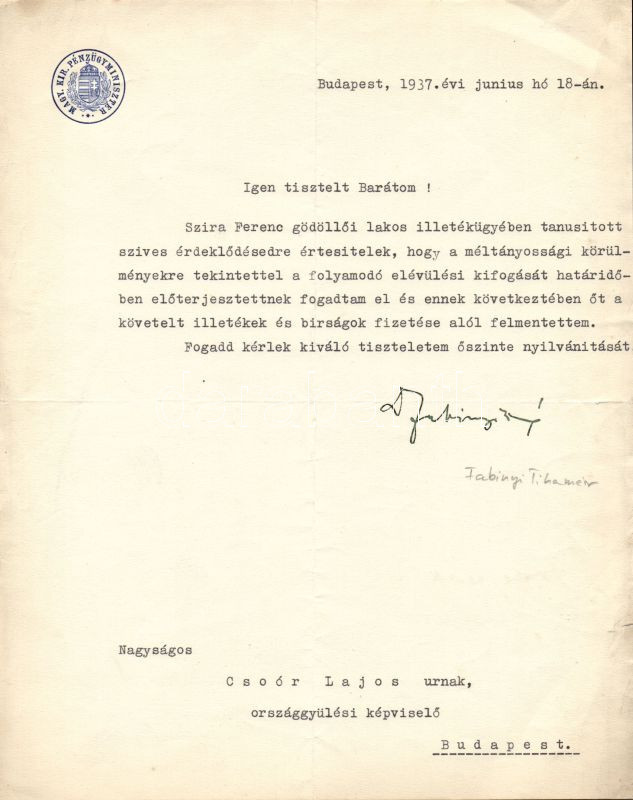 1937 Fabinyi Tihamér pénzügyminiszter aláírása