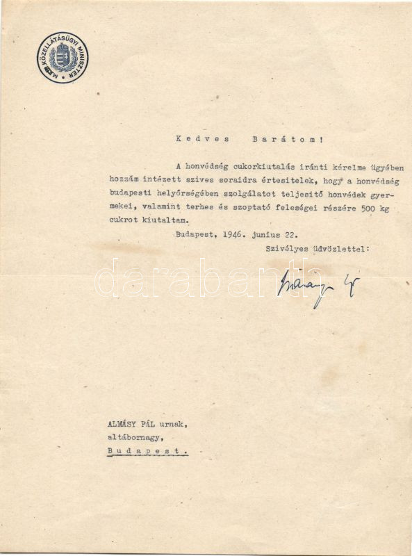https://www.darabanth.com/en/84-Online-auction/84.0/Other-collectibles/~310/1946-Baranyos-Karoly-kozellatasugyi-miniszter-alairasa~II178567
