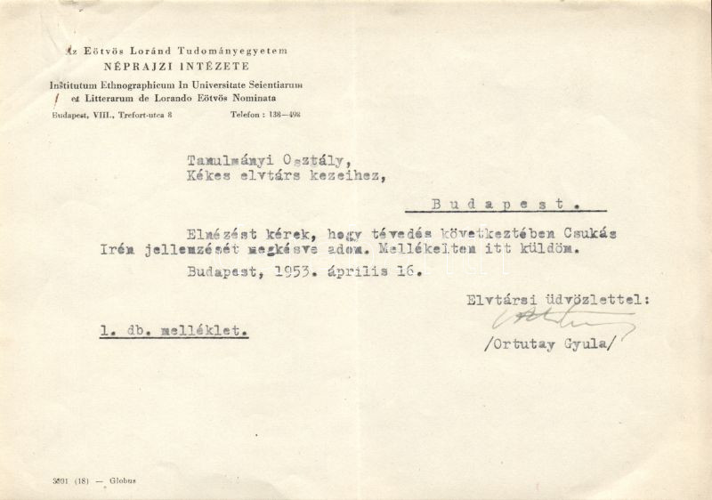 1953 Ortutay Gyula volt kultuszminiszter által aláírt levél