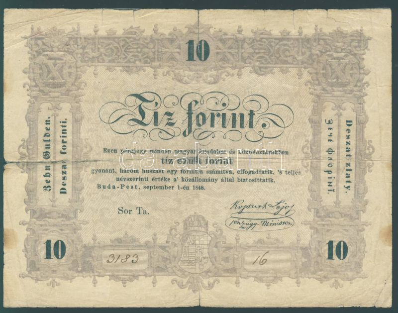 1848. 10Ft "Kossuth bankó" előlapon "gyanánt" szóban két pont van vess... https://www.darabanth.com/en/85-Online-auction/85.0/Numismatics/~531/1848-10Ft-Kossuth-banko-elolapon-gyanant-szoban-ket-pont-van-vesszo-helyett-hatlapon-t~II181126