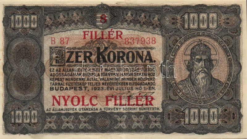 https://www.darabanth.com/en/85-Online-auction/85.0/Numismatics/~531/1923-1000K-8f-fny-sal-TIIplus-felso-szelen-papirhibabol-eredeo-paranyi-lyuk~II184151