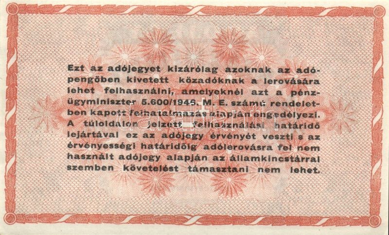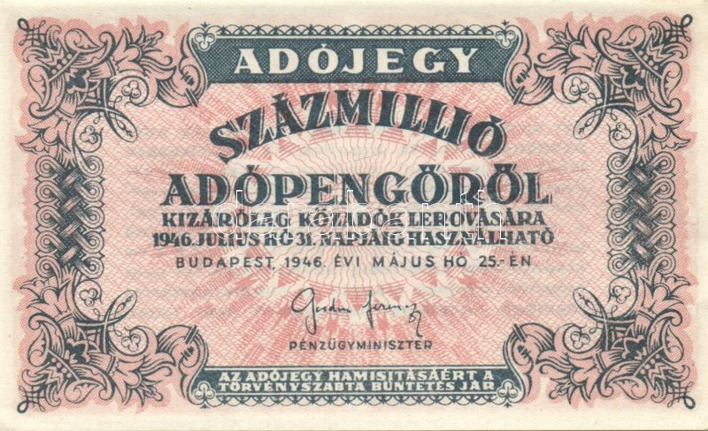 1946. 100.000.000AP vízjel nélkül, fehér papíron, hátlapi szöveg vasta...