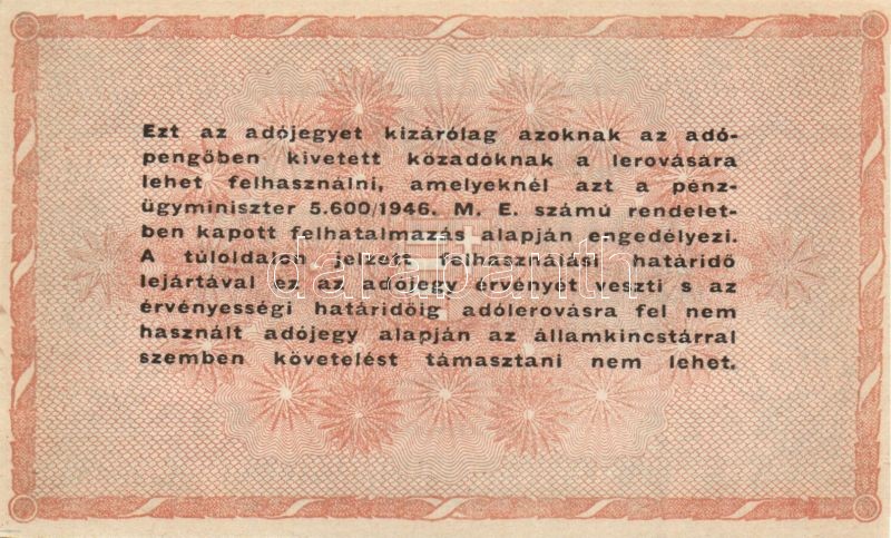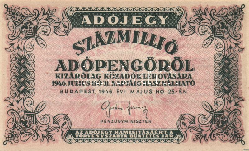 1946. 100.000.000AP vízjel nélkül, fehér papíron, hátlapi szöveg vékony betűvel T:I