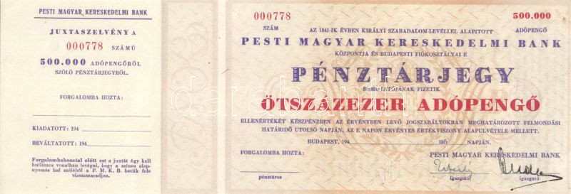 cca 1946. A Pesti Magyar Kereskedelmi Bank pénztárjegye 500.000AP-ről ...
