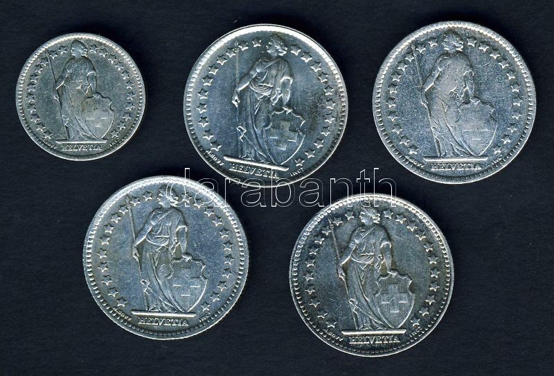 Svájc 1/2Fr Ag 1908 + 1Fr Ag 1916,1943,1944,1962 T:2/3,3 kis ph.