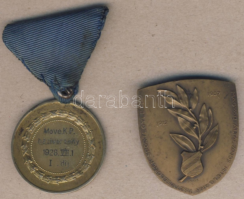 1928. "Move.K.P. háziverseny" díjérme szalaggal + 1937. "Magyar Általános Hitelbank Tisztviselőinek Sportegylete" Br emlékplakett. Szign:Z.Kiss T:2