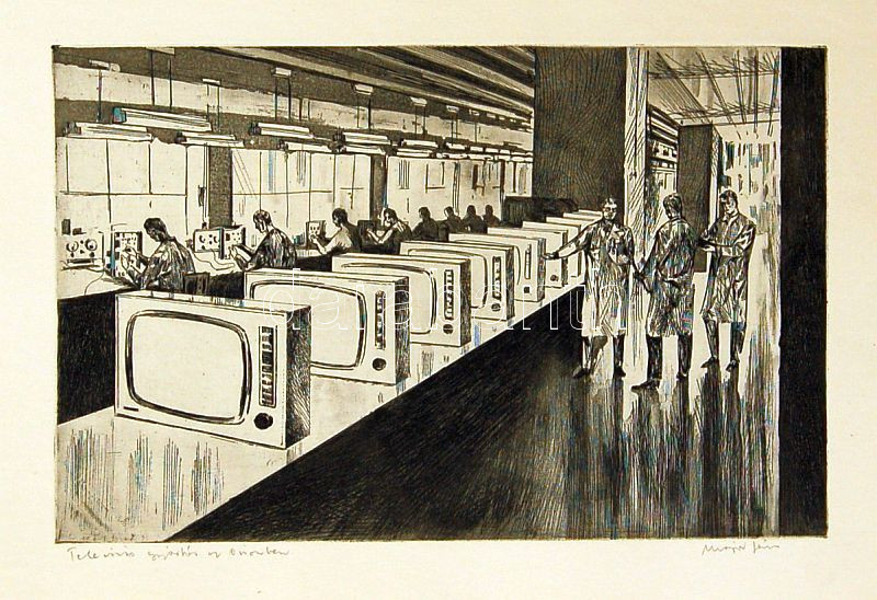 Márton János: Televízió gyártás az Orionban, szignált rézkarc 28x40cm