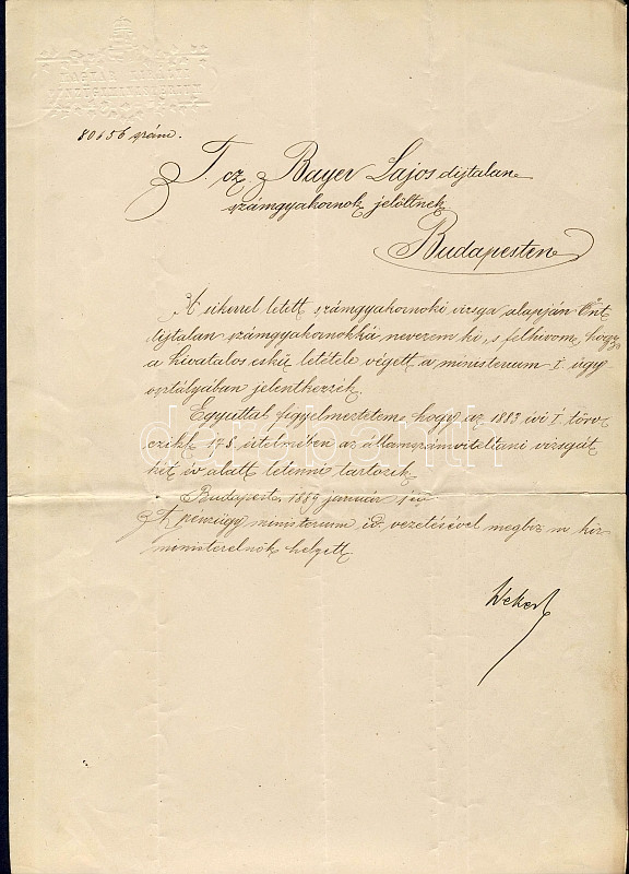 1889 Wekerle Sándor pénzügyminiszter aláírása levélen