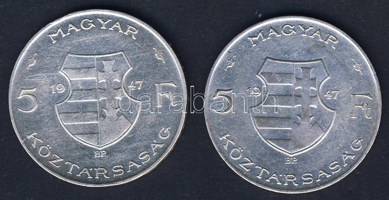 https://www.darabanth.com/en/91-Online-auction/91.0/Numismatics/~15171/1947-5Ft-Kossuth-Ag-tevveret-haj-homlokig-er-T3plus-1947-5Ft-Kossuth-Ag-T2-pici-ph-normal~II201963