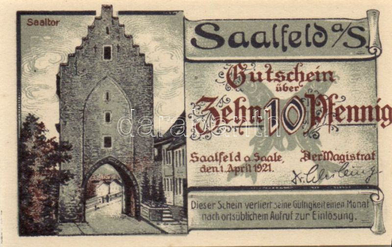 Német Birodalom/Weimari Köztársaság/Saalfeld 1921. 10Pf, 25Pf, 50Pf, 3...