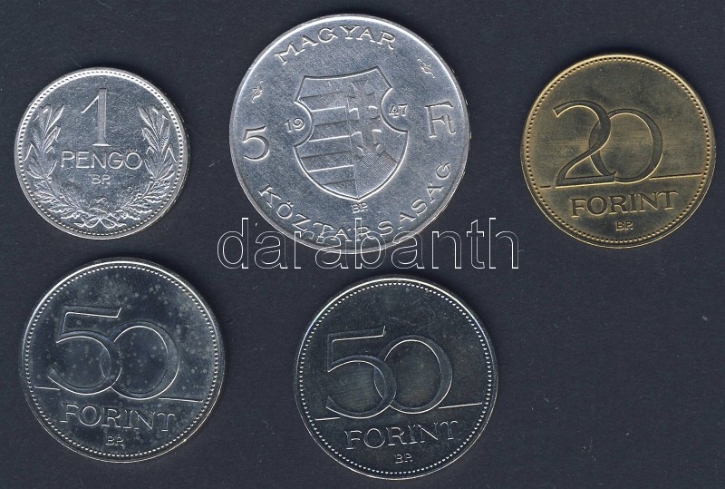 Kis tétel 1939. 1P Ag + 1947. 5Ft Ag "Kossuth" + 2003. 20Ft "Deák" + 2006. 50Ft "Vöröskereszt" (1x) + "1956" (1x) T:2,2/3,3 Összesen 5klf db!