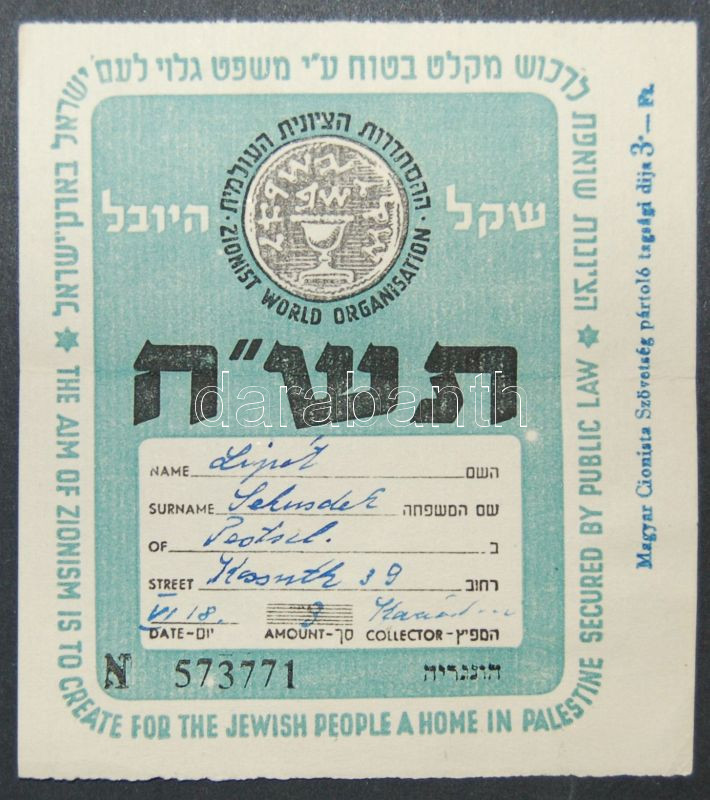 Magyar Cionista szövetség pártoló tagsági jegy tagsági bélyeggel