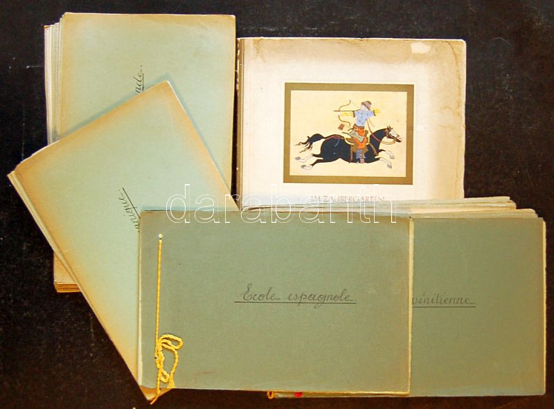 Description: cca 1940 6 db házilag összeállított füzet különböző festészeti stílusokról képekkel, képeslapokkal, nyomatokkal + 1 keleti festészetet bemutató dekoratív német kiadvány