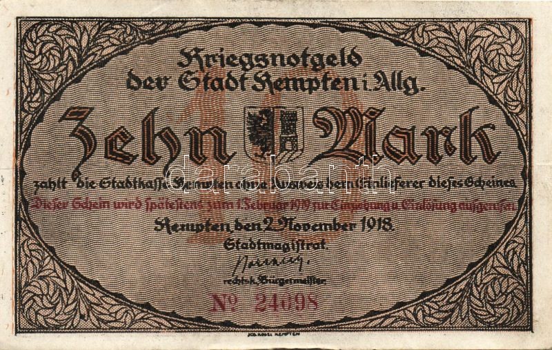 Német Birodalom/Császárság/ Kempten 1918. 10M(2x) egymásutáni sorszámm...