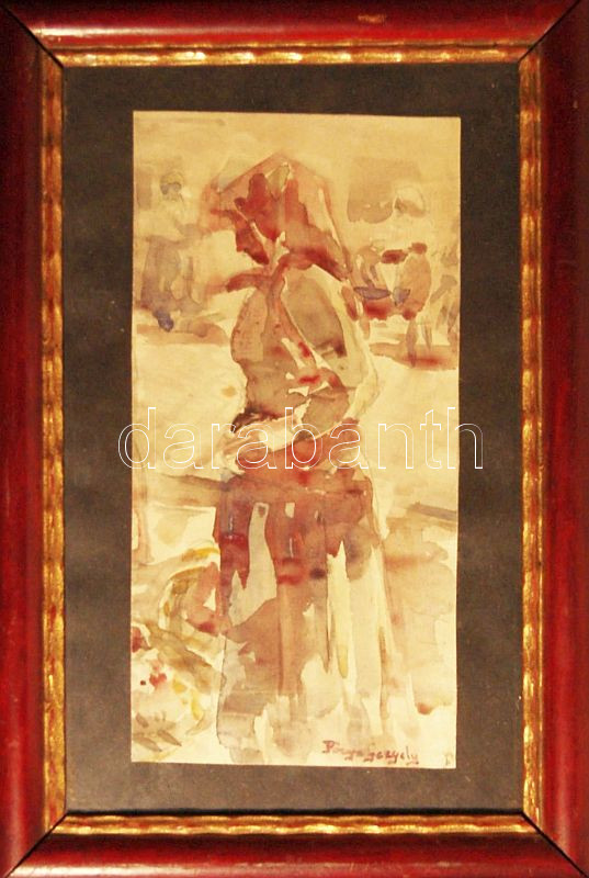 Pörge Gergely (1858-1930): Vásárban, akvarell, papír, szignált keretben 20x30 cm