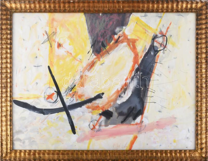 Misch Ádám (1935-1995): Kompozíció sárgában. Vegyes technika, papír, jelezve középen lent. Dekoratív, üvegezett, kissé sérült fakeretben. 47,5x63 cm.