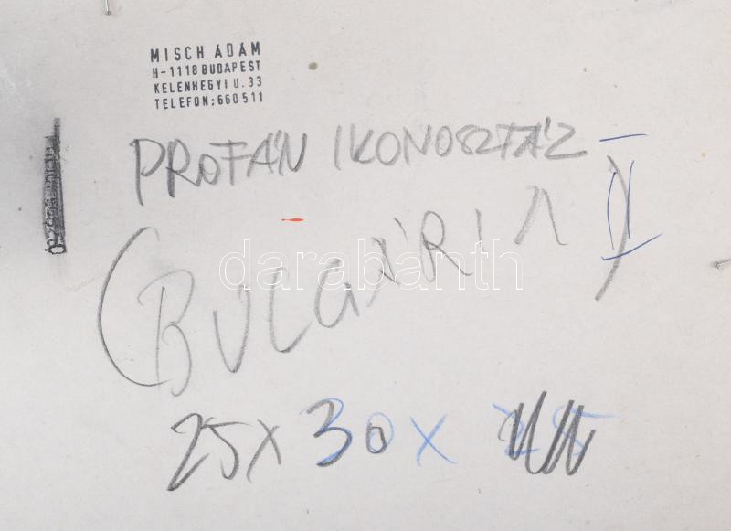Description: Misch Ádám (1935-1995): Profán ikonosztáz (Bulgária II), 1985 körül. Vegyes technika, papír, jelzett a hátoldalán a művész bélyegzésével. Üvegezett fakeretben. 25×30 cm.