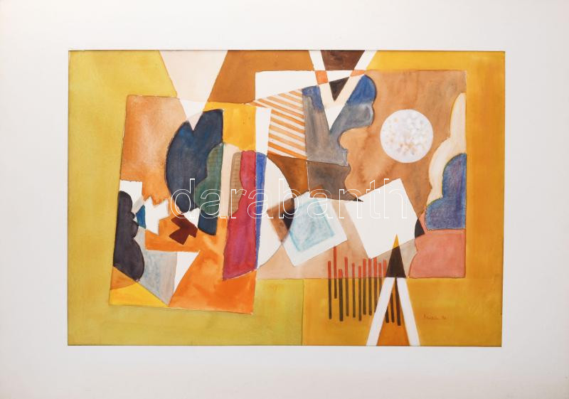 Description: Misch Ádám (1935-1995): Utazás közben II., 1975. Akvarell, papír, jelezve jobbra lent. Hátoldalán Misch Ádám autográf feliratával. Paszpartuban. 50×74,5 cm.