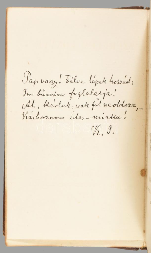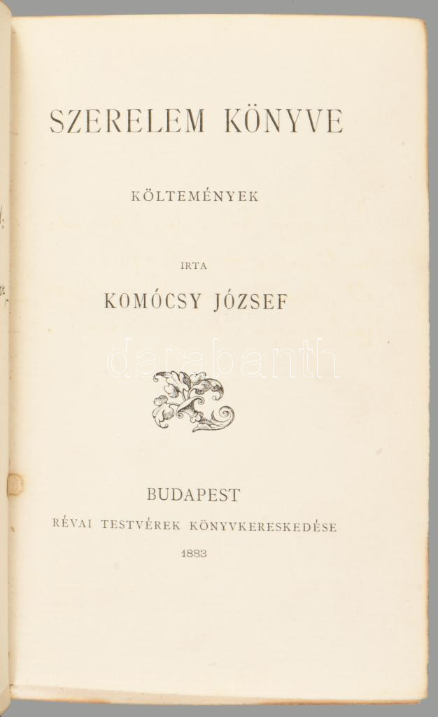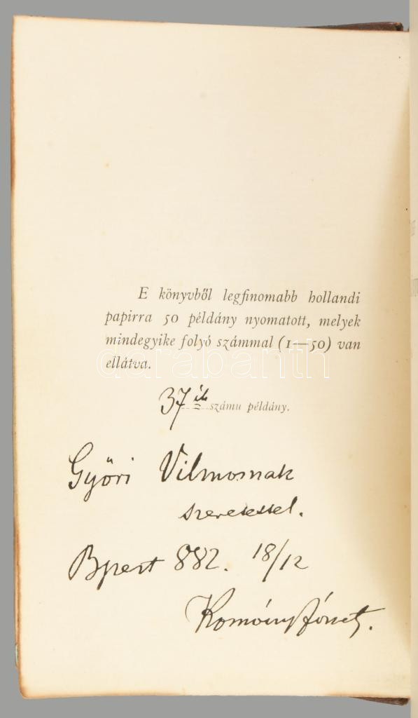 Komócsy József: Szerelem könyve. Költemények. Számozott (37./50), a szerző, Komócsy József (1836-1894) költő, újságíró, a Petőfi Társaság alelnöke által Győry Vilmos (1838-1885) evangélikus lelkész, teológus, író, műfordító részére dedikált példány! Bp., 1883, Révai, XVI+198 p. Első kiadás. Félbőr-kötésben, sérült gerinccel, belül a lapok nagyrészt jó állapotban.
