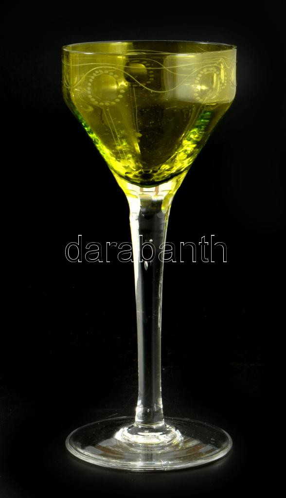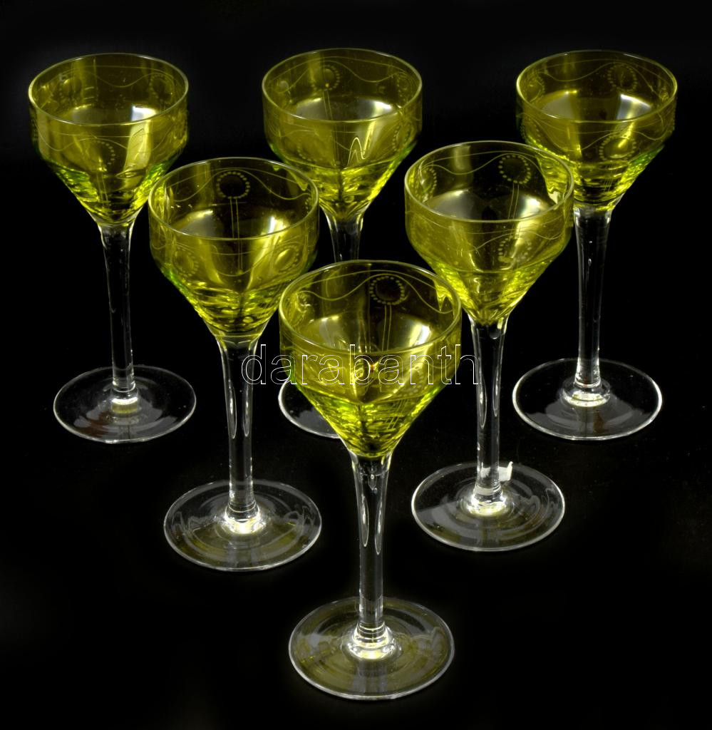 cca 1910 Osztrák art nouveau 6 személyes likőrös pohár szett, köszörült díszítéssel, uránszínű színezéssel, hibátlan, m: 16,5 cm