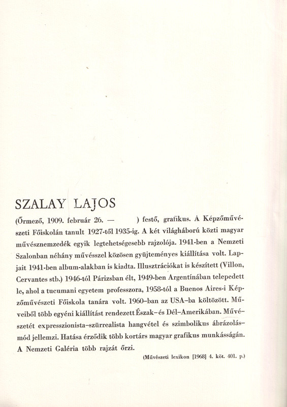Számozatlan oldalakon válogatás Szalay Lajos (1909-1995) grafikusművész rézkarcaiból, időrendi sorrendben.