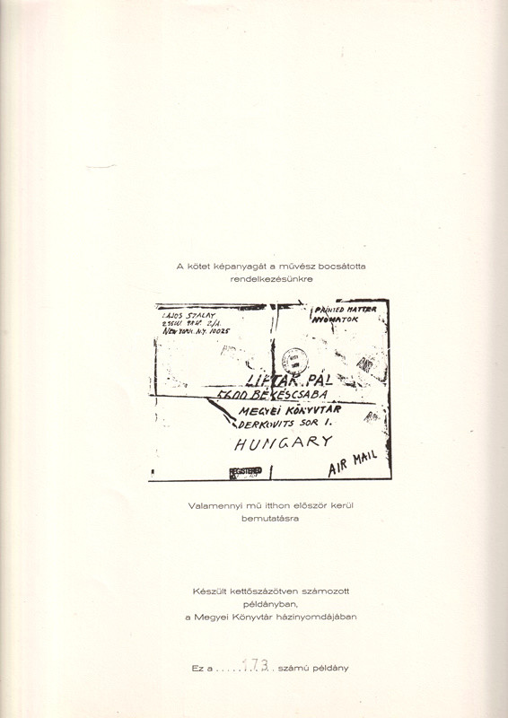 Kolofon: "A kötet képanyagát a művész bocsátotta rendelkezésünkre. Valamennyi mű itthon kerül először bemutatásra. Készült 250 számozott példányban. Ez a 173. számú példány".