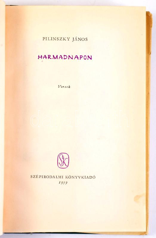 Pilinszky János: Harmadnapon. Versek. Bp., 1959, Szépirodalmi Könyvkidó, 112+[4] p.+ 1 t. Első kiadás. Kiadói félvászon-kötés, minimálisan sérült kiadói papír védőborítóban. Megjelent 1000 példányban.