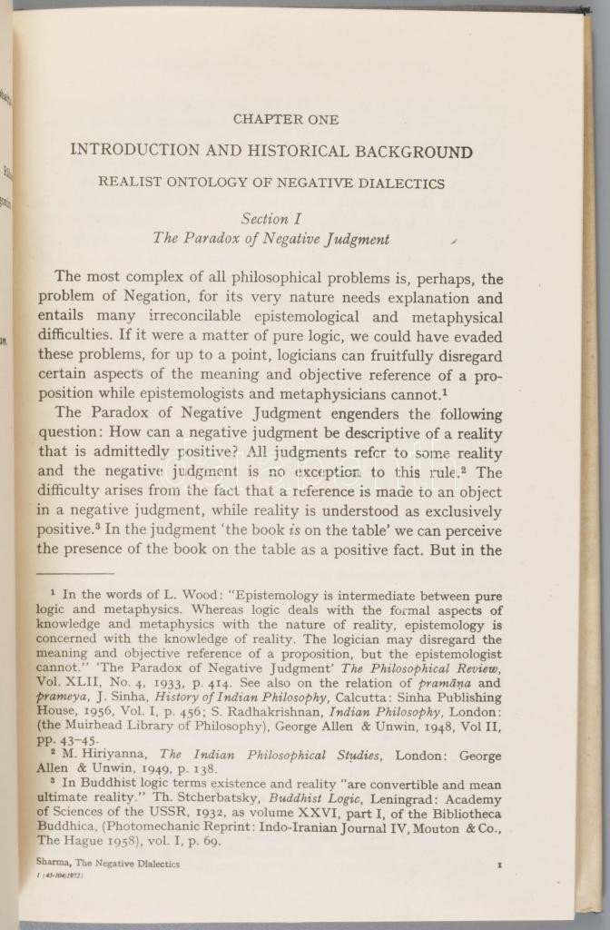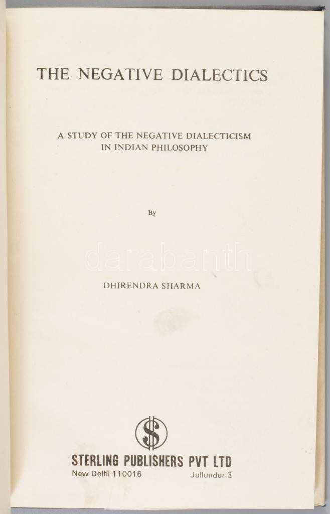 Dhirendra Sharma: The Negative Dialectics. A Study of the Negative Dialecticism in Indian Philosophy. New Delhi, Sterling Publishsers. 155p. Kiadói egészvászon kötés, papír védőborítóval, jó állapotban.