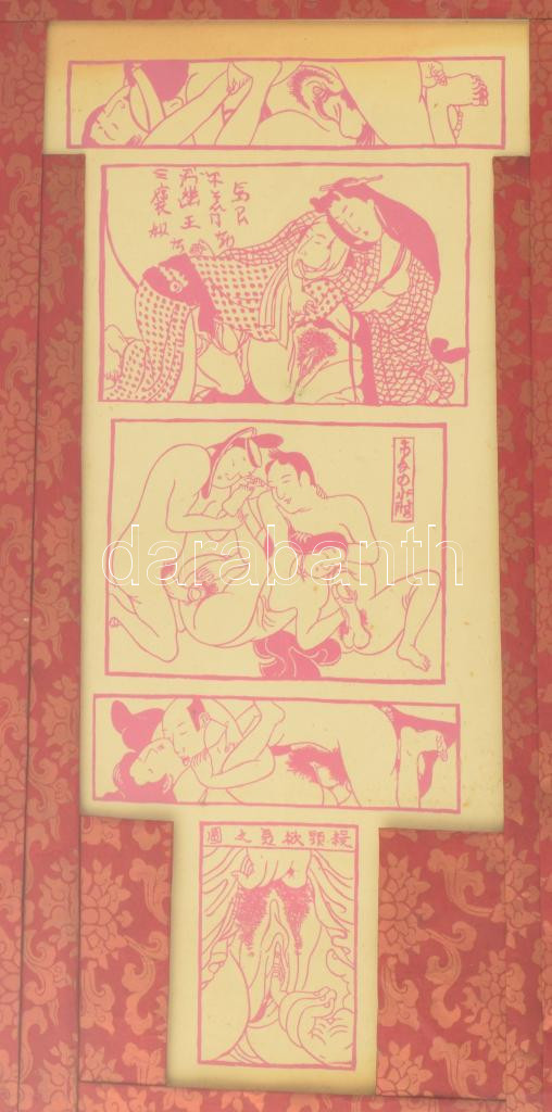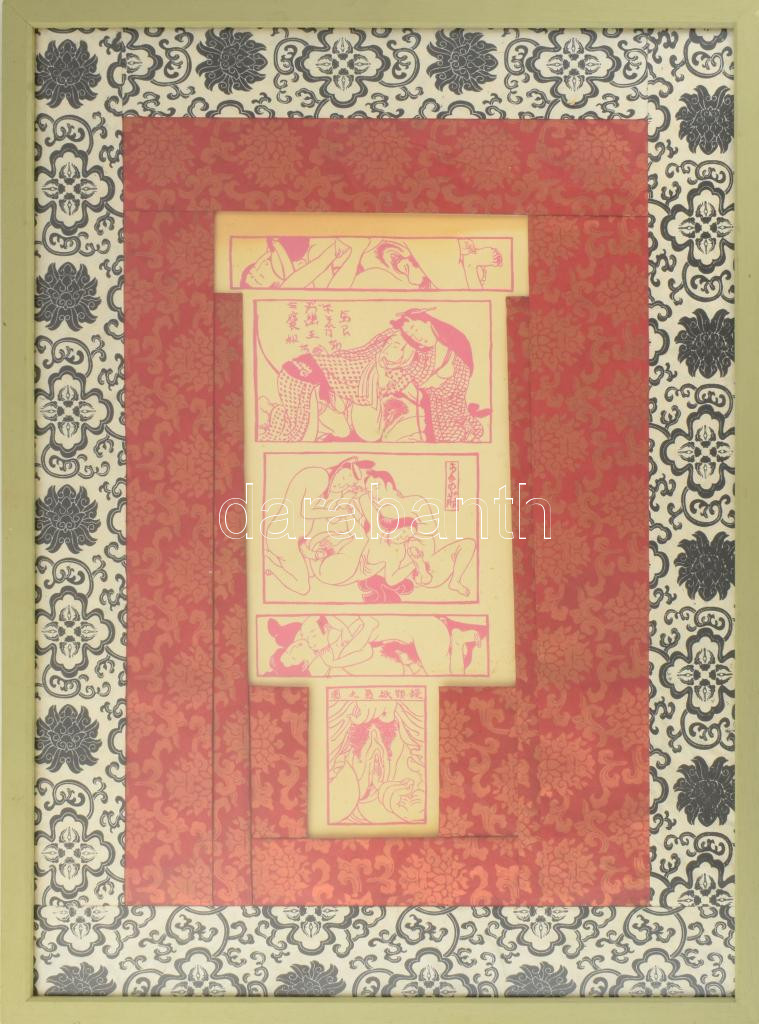Olvashatatlan jelzéssel, feltehetően japán művész: Erotikus-pornográf jelenetek. Nyomat, papír, egyedi Albert Katalin által készített paszpartuban, üvegezett fakeretben. 42,5x20 cm