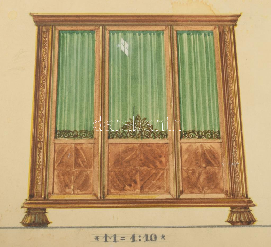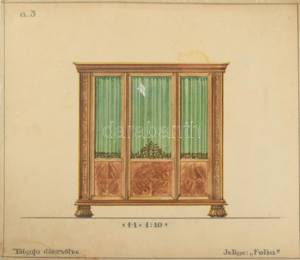 cca 1900-1940 Historizáló tölgyfa bútor tervrajza. Akvarell, ceruza, karton, m 1:10, jelzés nélkül, jelige: "Folia", hátoldalán kisebb felületi sérülésekkel és ragasztásnyomokkal, 32,5×37,5 cm