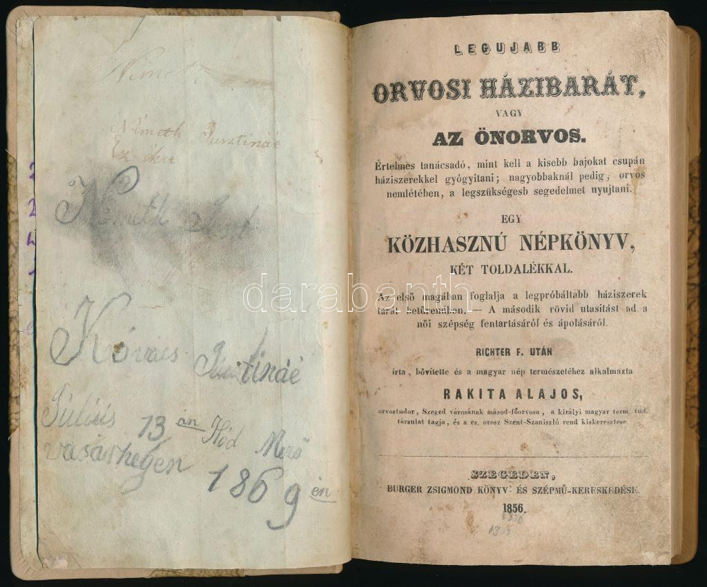 Rakita Alajos: Legujabb orvosi házibarát, vagy az önorvos. Értelmes tanácsadó, mint kell a kisebb bajokat csupán háziszerekkel gyógyitani, nagyobbaknál pedig, orvos nemlétében, a legszükségesb segedelmet nyujtani. Egy közhasznú népkönyv, két toldalékkal. Richter F. után irta, bővitette és a magyar nép természetéhez alkalmazta - - . Szeged, 1856, Burger Zsigmond, XIV p.+ [5]-299 p. Egyetlen kiadás. (A tartalomból: Ebaga. Ebdüh. Hártyás-torokgyík. Íztapló. Kőbántalmak. Pokolvar. Tökdaganat. Tüdőtakár. Vérvizelet. Részegség. Fuladtak (vízben), és ezek életre hozása. stb.) Átkötött félbőr-kötésben, kissé viseltes, foltos lapokkal, ázásnyomokkal, a belső kötéstáblán és a szennylapokon bejegyzésekkel, firkákkal. Ritka!