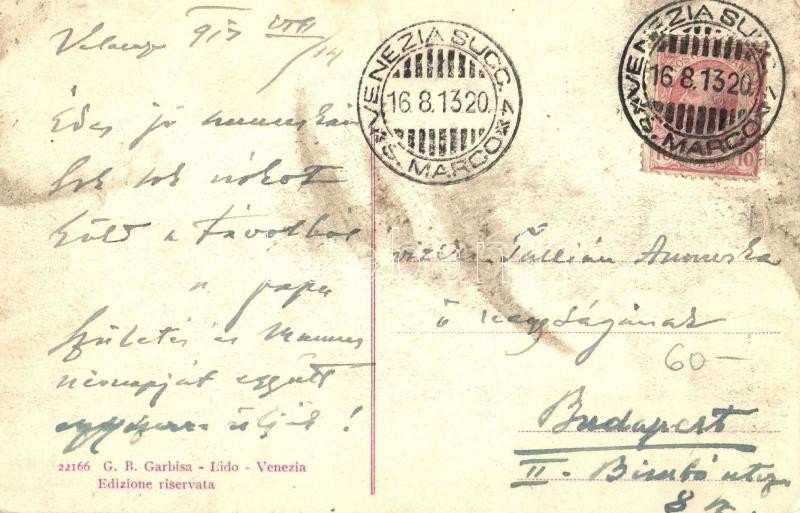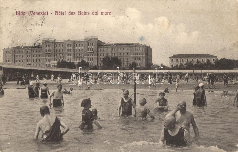 Venice, Venezia, Lido; Hotel des Bains dal mare. G. B. Garbisa / bathing people in the sea, beach life (fl)