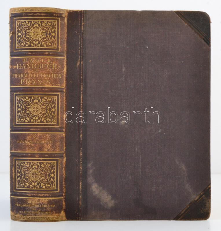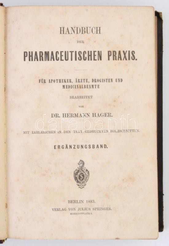 Dr. Hermann Hager: Handbuch der pharmaceutischen praxis. Für apotheker, ärtze, drogisten und medicinalbeamte. Berlin, 1883, Julius Springer. Kiadói aranyozott gerincű félbőr kötés, kopottas gerinccel, és borítóval, szövegközti illusztrációkkal, német nyelven./ Half-leather-binding, in german language.
