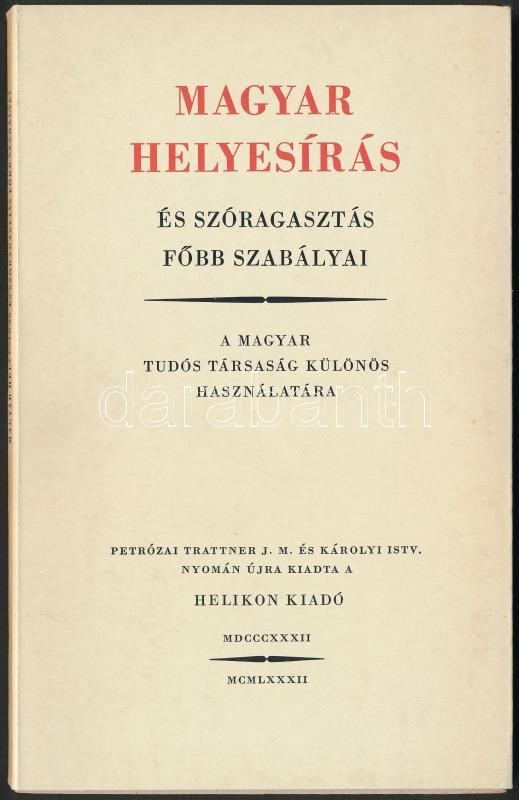 Description: Magyar Helyesírás és szóragasztás főbb szabályai. A magyar tudós társaság különös használatára. Petrózai Trattner nyomán újra kiadta Helikon Kiadó. 1982. Hasonmás kiadás. Kiadói karton kötésben.