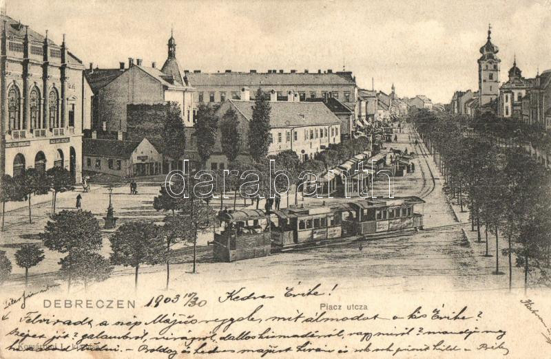 Debrecen, Piac utca, Balla Lajos asztalos, üzletek, városi vasút, villamos, Komáromi I. kiadása