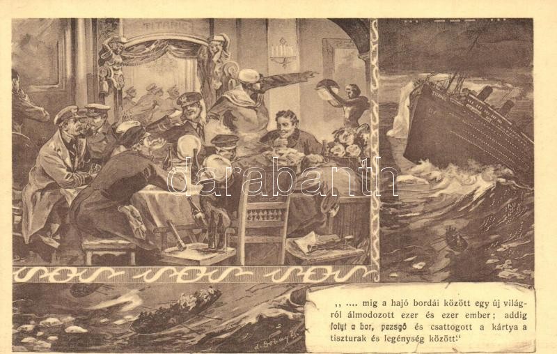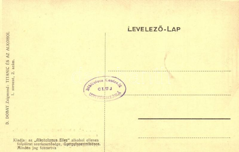 Titanic és az alkohol. Kiadja az Alkoholizmus ellen alkohol ellenes folyóirat szerkesztősége. 1. sorozat 2. szám / RMS Titanic. Titanic and the alcohol, anti-alcohol propaganda, Hungarian art postcard serie. s: D. Dobay Zsigmond