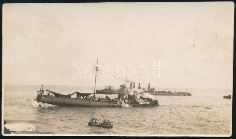 1915 Az osztrák-magyar Tb 51-es torpedónaszád(Kaiman-Klasse) süllyedése egy francia tengeralattjáró torpedótalálata után, hátoldalon feliratozva, 66x10 cm / Austro-Hungarian Kaiman-class torpedo boat 51, 6x10 cm