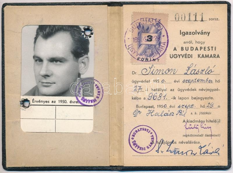 1950 Fényképes ügyvédi igazolvány, illetékbélyeggel