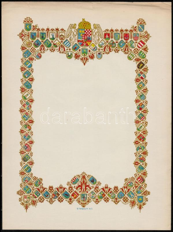 cca 1920 Díszes levélpapír magyar középcímerrel és a vármegyecímerekkel, Stádium Rt., szélein kis gyűrődésekkel illetve szakadással