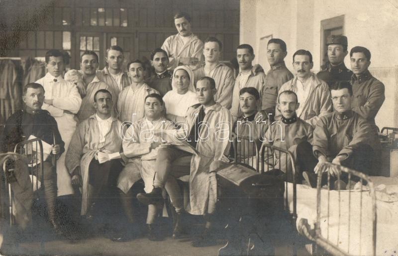 Description: 1915 Budapest, Révész utcai hadi kórház, sebesült katonák nővérrel és orvossal / WWI K.u.k. military hospital in Budapest, interior, soldiers with nurse and doctor. photo (EK)