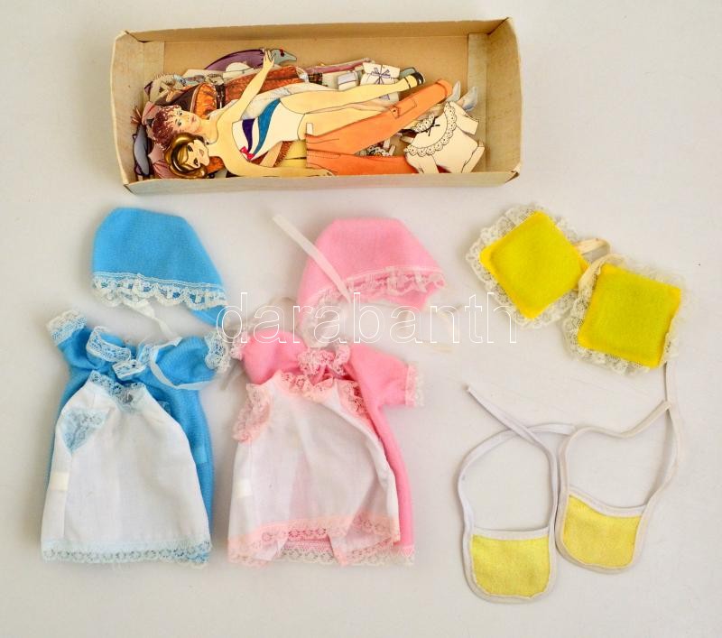 Retró babaöltöztető játék, papír ill. szövet, két kis doboznyi