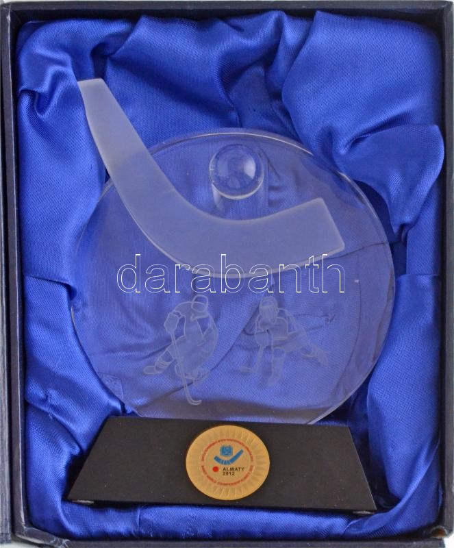 Kazahsztán 2012. "Jéglabda Világbajnokság 2012 Almaty" üvegbÅ‘l készült, talapzaton álló trófea, eredeti dobozában, valószÃnűleg a 2012-es B-csoportos Világbajnokság 3. helyén végzett magyar válogatott egyik tagjának (160x110mm) T:1