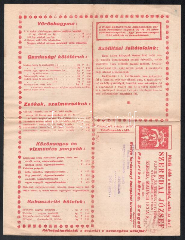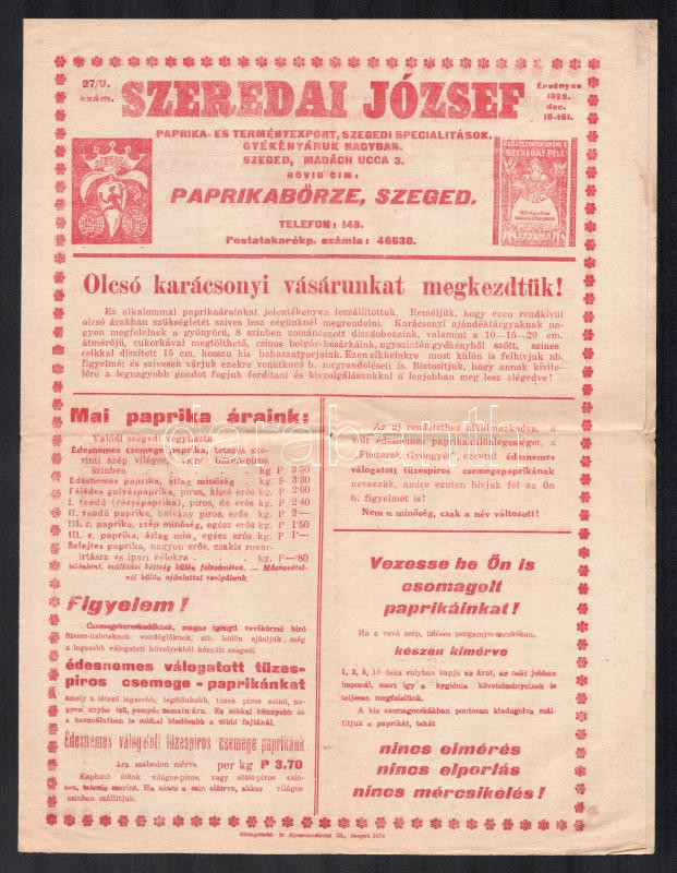 1929 Szeged, Szeredai József Paprika- és terménykivitel gyékányáruk na...