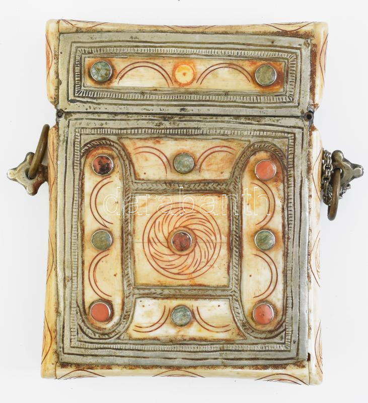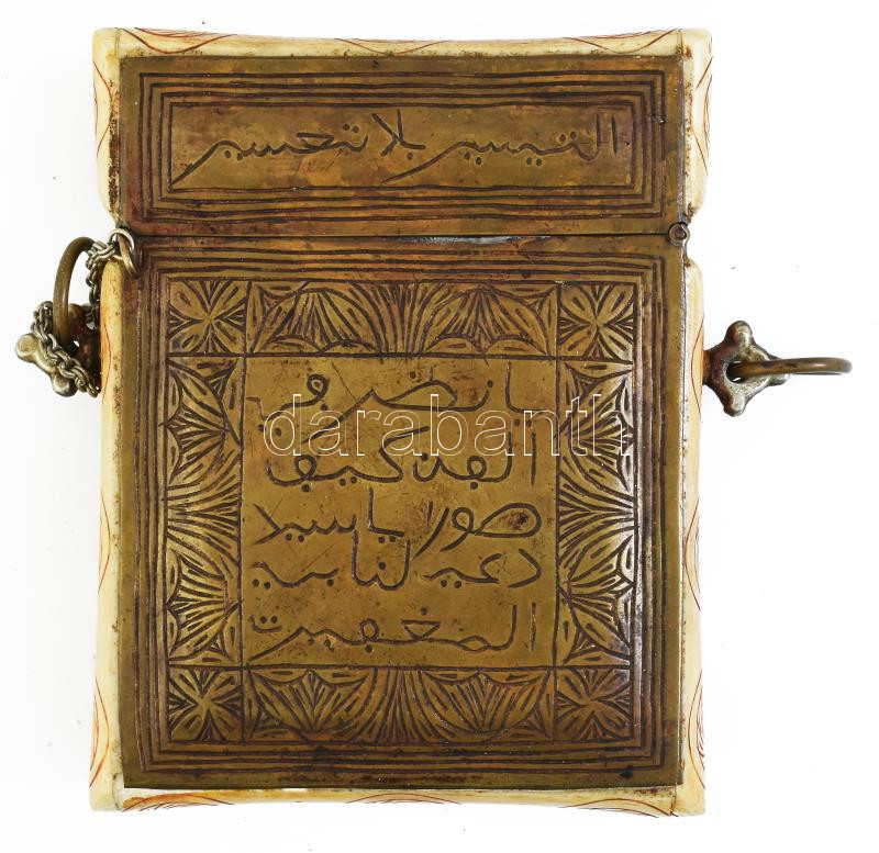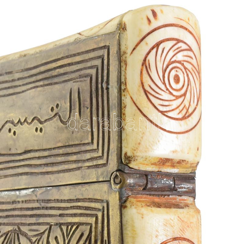 Csont tartó edény. Faragott csont, féldrágakövekkel. Réz zárral, hátán korán idézet 13x15 cm
